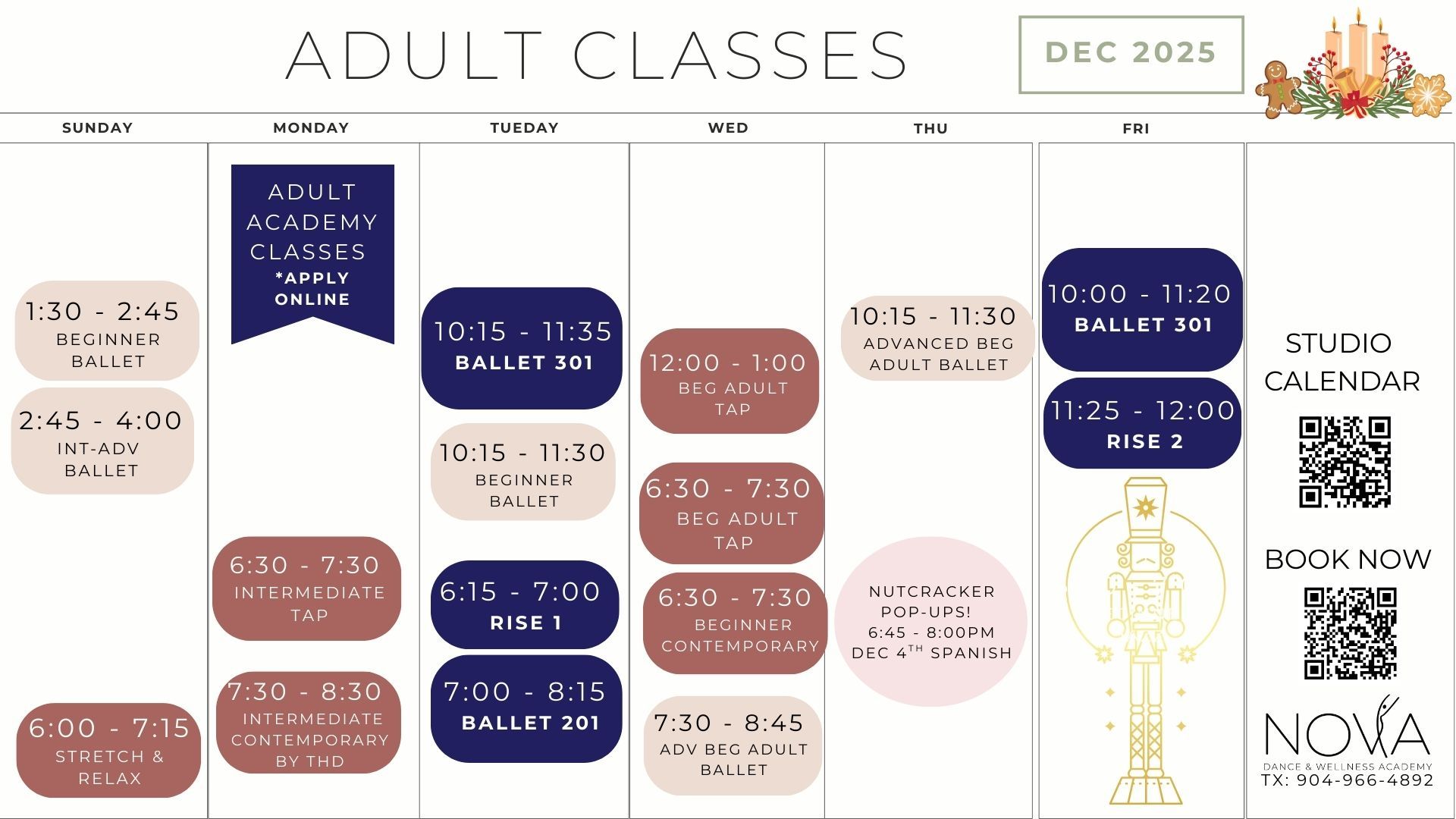 NOVA's Adult Academy exists to provide a scaffolded curriculum, consistency, and community. Empowering adult dancers and challenging them to grow in their technical abilities with others who love to dance!